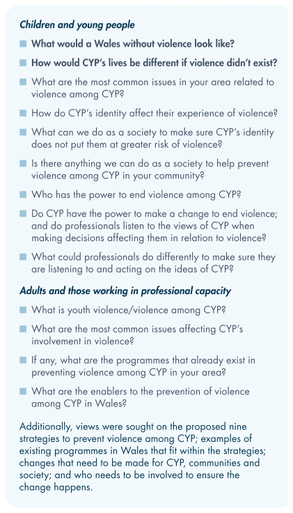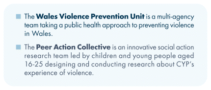 Working directly with CYP is essential in developing effective strategies to prevent violence through a public health, whole-system approach. Extensive engagement with CYP has facilitated the creation of a shared understanding and approach across Wales, ensuring that the strategies are tailored to meet their specific needs and challenges. Such engagement has been crucial in identifying key areas of concern and ensuring that CYP have a voice in shaping the interventions aimed at promoting their safety and well-being.