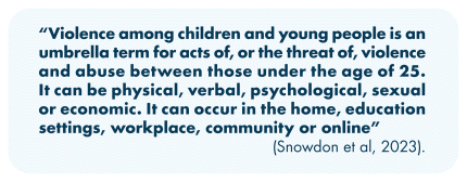 Violence among children and young people (CYP) is a complex societal issue that has detrimental impacts on the health and well-being of our population across the life-course. Those experiencing violence can suffer long-term consequences to their physical, mental, and social well-being (Krug et al., 2002). Preventing violence before it occurs and developing effective response strategies can improve the health and well-being of individuals and communities, and have a wider positive impact on the economy and society (World Health Organization, 2021).