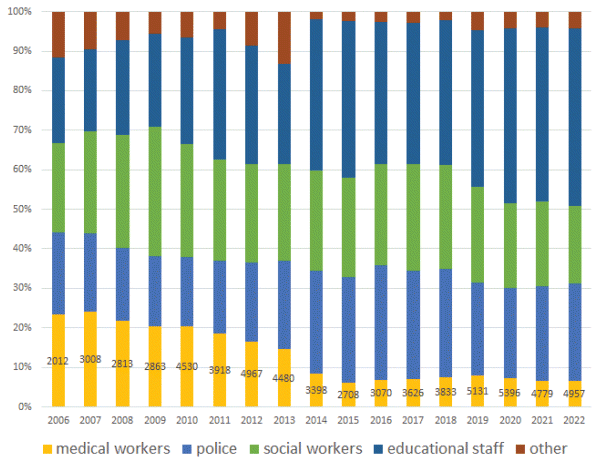 FIGURE 1 Percentage of cases reported by compulsory reporting agencies, 2006 to 2022. | ||