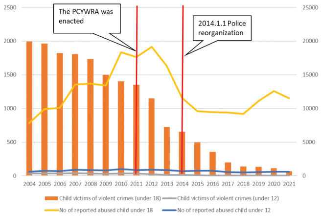 Since the Ministry of Health and Welfare took over child protection statistics in 2012, the annual number of abused children is approximately between 10,000 and 17,000. Two milestones are noted in Figure 2. First, the PCYWRA enactment coincides with the peak of reported abused cases in 2012. Both the number of reported cases and police-recorded child victims of violence declined significantly after 2011. Second, police-recorded violent crime against children continued to drop after police reorganization in 2014, and the reported child abuse cases remain steady, without a significant rise, since 2015 (see Figure 2).