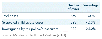 Several measures have been taken to improve first responders’ child abuse identification capabilities. Since 2018, 7 hospitals have opened child protection medical integrative centres. There are plans to expand this number to 10 centres in the future. For those hospitals without integrative centres, a children’s protection medical unit must be in place to screen suspected child abuse cases. Admitted children in these centres are evaluated by the paediatrics department, and if it is suspected that these children are abused, their cases will be investigated by the police. The statistics show that among 100 cases admitted to the centres, 42.6 are suspected child abuse and 24 are investigated by the police and prosecutors (see Table I). On 1 May 2019, the Ministry of Justice enacted a protocol for investigating serious child abuse cases.