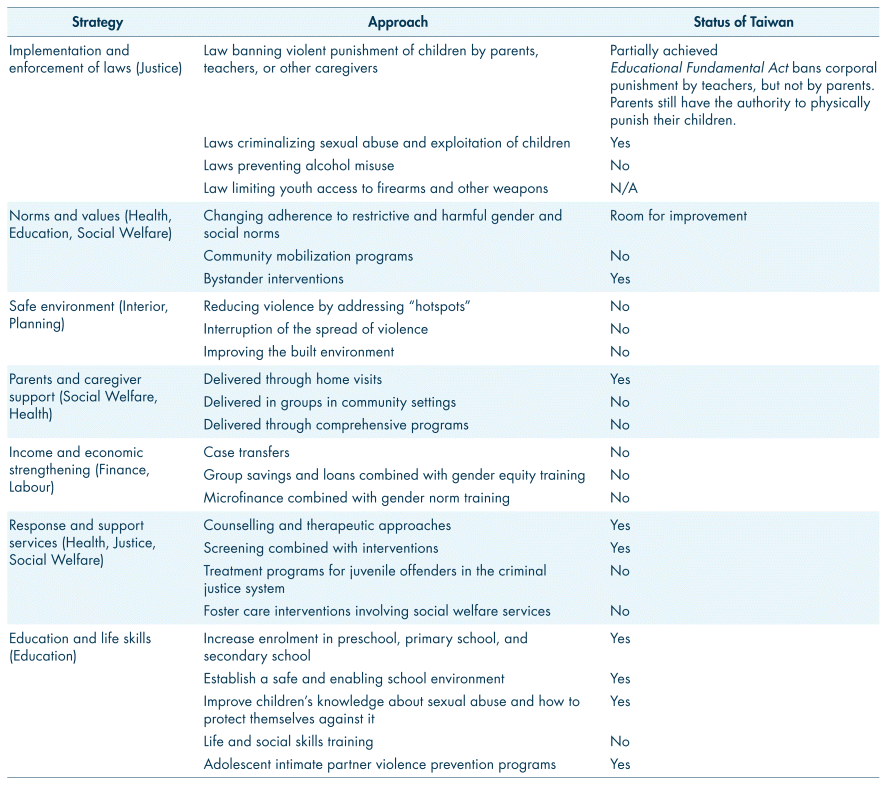 In reviewing the seven strategies recommended by INSPIRE, we found that the current CPS in Taiwan fulfills many approaches but falls short in two areas, namely a safe environment and income and economic strengthening. In other areas, there is also room for improvement. For example, the Educational Fundamental Act bans corporal punishment by teachers, but not by parents. We need to build a consensus that punishment should no longer be used as an excuse for child cruelty. Supporting parents and caregivers is also needed at the community level, especially focusing on parenting and social skills (see Table II).