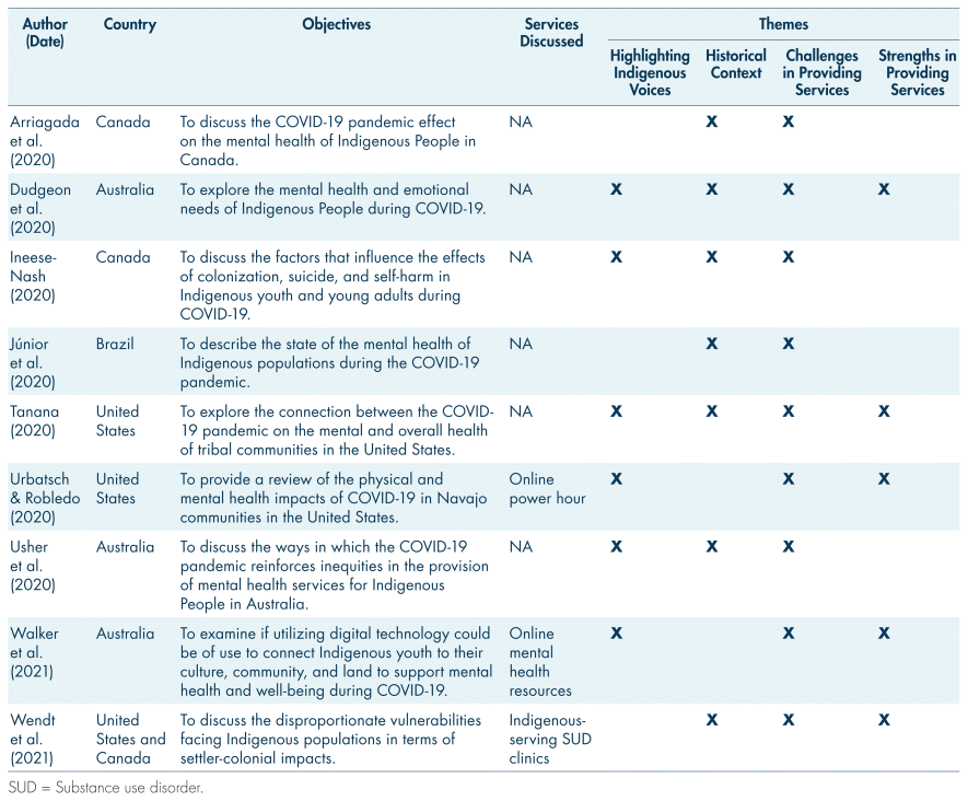 Three inclusion criteria were used for this scoping review: (1) Literature should include a sample of Indigenous People, or be based around a discussion about Indigenous People, in or outside of Canada; (2) Literature was published between 2020 and early 2021; and (3) Literature should discuss overall mental health, experiences providing holistic mental health services during COVID-19. Nine included papers met the inclusion criteria. Based on the research questions, review of the identified articles, and consultant interviews, common themes were found (see Table I), as discussed later (see Results).