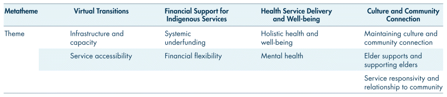 The narrative thematic analysis identified three core metathemes from consultant interviews: (1) virtual transition, (2) financial support for Indigenous services, and (3) health service delivery and well-being (Table II).