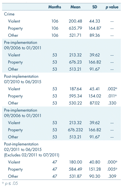 The study uses a pre- and post-implementation methodology, where the police-reported crime rates are examined 53 months prior to the introduction of the CMPA and 53 months afterward. CMPA became operational in February 2011, and the analyses focus on two timeframes. The first is the 53 months immediately preceding implementation (January 1, 2006 to January 1, 2011) and 53 months following the CMPA’s introduction in February 2011 (2011–2015). The second series of analyses excludes six months between February 1, 2011 to July 31, 2011 to account for the fact that the CMPA start-up was an evolutionary process and we shouldn’t expect immediate results (e.g., initiating a crime reduction strategy on February 1 and expecting a meaningful change by March 1). Because of the longitudinal nature of the data, t-tests were used to examine changes in the average monthly offence rates. This strategy has been used in studies examining the pre- and post-impacts of police worn body cameras (Jennings, Lynch, & Fridell, 2015) and after the introduction of gunshot detection systems (Choi, Librett, & Collins, 2014).
