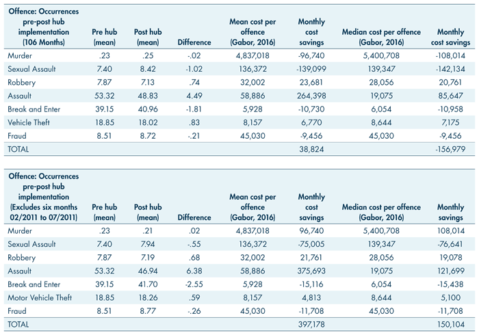 Although our findings show that the Hub model is a promising crime control strategy, there are a number of caveats that need to be considered. First, our research design makes it impossible to attribute the crime and subsequent cost savings to the CMPA alone, as other law enforcement or justice system interventions might be responsible for some of these changes. Moreover, other factors unrelated to the justice system, such as improving economic conditions, might moderate crime more effectively at the civic level than the activities of the police, courts, or corrections. In addition, serious offences, such as homicides, might be sensitive to a number of factors apart from the influence of the CMPA. The delivery of prompt emergency medical care, for example, might make the difference between a homicide that costs society $5.4 million and an aggravated assault offence, which costs society a fraction of that amount (Gabor estimated that the median cost of an aggravated assault as $113,573). Furthermore, with respect to the cost analysis, a complete accounting of the crime control benefits of the CMPA could not be undertaken as data were only available for seven types of crimes. As a result, offences such as wilful damage and other public order crimes that occur very often were not considered in the analysis. Despite that limitation, the efforts of the CMPA still resulted in a substantial cost savings to society.