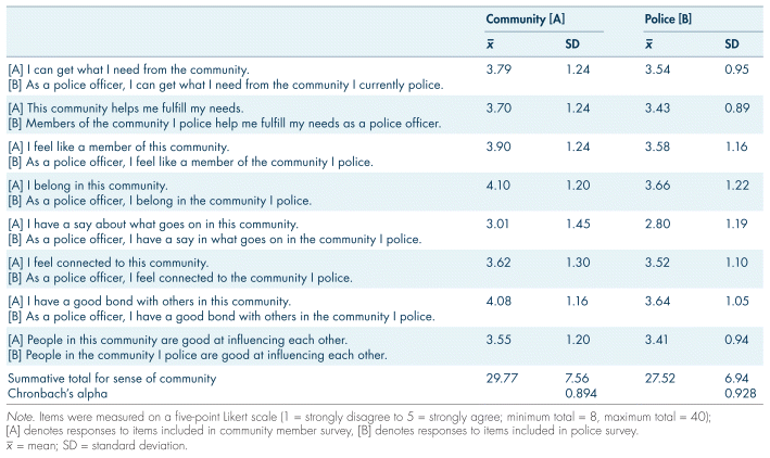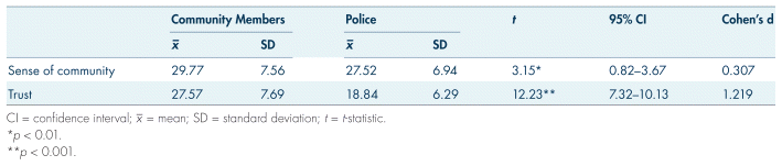 Summed mean responses for SOC, community trust, and police trust variables are displayed in Tables II and III. Overall, community and police responses for most SOC items indicate somewhat positive feelings, although police held relatively lower levels (27.52; standard deviation (SD) = 6.94) than the community (29.77; SD = 7.56). As with SOC, the summative trust total for police respondents (18.84; SD = 6.29) was relatively lower than for community members (27.57; SD = 7.69). All summed measures showed high degrees of reliability, with all Cronbach’s alpha values equalling or exceeding 0.894.