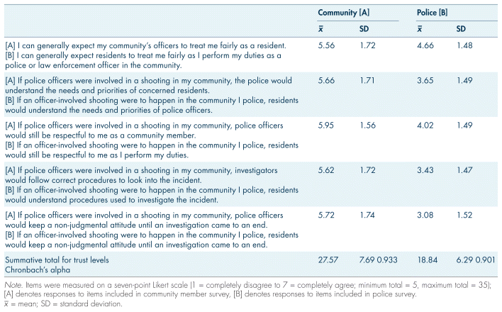 SOC measures adapted validated items available in the literature (Peterson et al., 2008) (see Table II). Responses were measured on a five-point Likert scale (1 = strongly disagree to 5 = strongly agree), and a single summative SOC variable was calculated for both community members and police officers. For trust, the team wrote survey items incorporating Stoutland’s (2001) work assessing how both officers and residents evaluate aspects of respect, shared interests/priorities, dependability, and competency in a specific context of police-involved shootings. For this study, we created two different scales of trust – police trust (of community members) and community trust (of police). Each scale was composed of five mirrored items measured on a seven-point Likert scale (1 = completely disagree to 7 = completely agree) (see Table III).