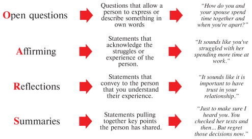 OARS can be used strategically to prompt an individual to give longer responses and hence more information. Figure 2 provides an example of how it can be applied in the context of identifying coercively controlling behaviours.