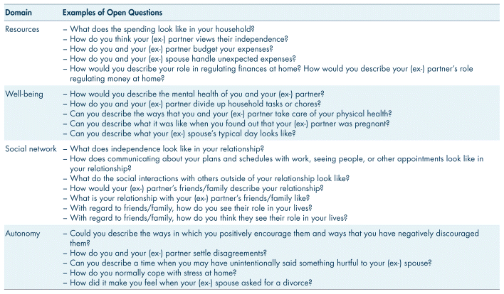 Open questions are questions that cannot be responded to with short, abbreviated answers. Using open questions allows the interviewer to get a better understanding of the interviewee’s thoughts, feelings, and interpretations, while also facilitating a collaborative environment by allowing the interviewee to respond in their own words and guide the discussion. Table I provides several examples of open questions that can be used in the context of questioning the interviewee about the presence of coercively controlling behaviours by domain.