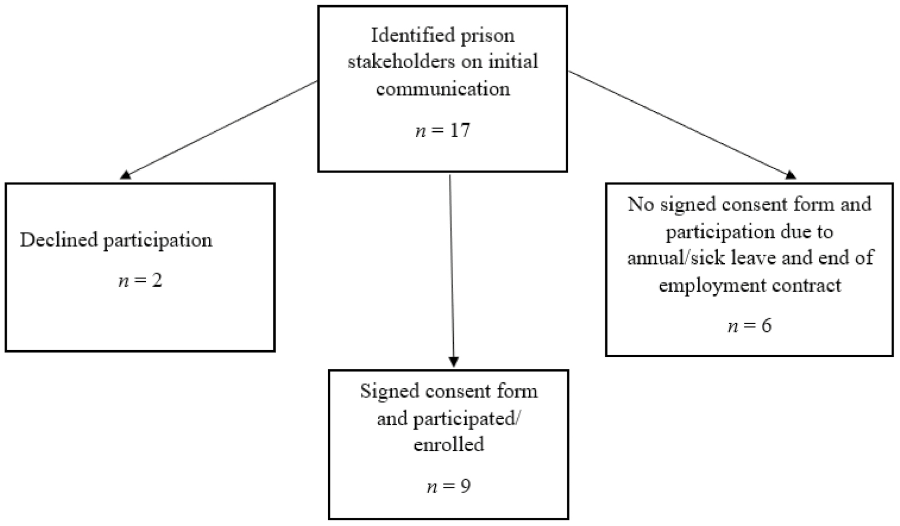 We emailed the head of the YCC, who assisted in mobilizing all the stakeholders working with YCWL at the centre. Prison stakeholders are staff who are responsible for the prison’s management and rehabilitation programs. On initial communication, there were 17 prison stakeholders, and only 9 participants formed part of the final sample by consenting to participate in the study. Reasons for the final sample are as follows: (1) six prison stakeholders were not able to consent and take part in the study, as they were on sick or annual leave at the time of the study and data collection, (2) three declined participation via telephonic communication to author WN, (3) one committed to another study running at the same time, and (4) one of them was external service provider who was at the end of their contract at the YCC, and could not consent and take part in the study (Figure 1).