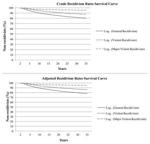 The primary aim of this study was to report the recidivism rates for the NCR population throughout Alberta’s history. In the study period, 19.7% of NCR individuals reoffended, with 12.6% of those reoffenses being violent. Lower recidivism rates were found for more severe crimes, namely sexual violence (0.75%) and major violent recidivism (4.6%). Furthermore, recidivism risk for severe crimes stabilized faster than less severe crimes (10 and 20 years, respectively). The findings of this study converge with previous research showing similarly low rates of general and violent recidivism among Canadian NCR samples (22%; Charette et al., 2015) and international NCR samples (Marais & Subramaney, 2015; Wang, Zhang, Jiang et al., 2007; Bonta et al., 1998). Furthermore, the results show that those NCR persons under the Alberta Review Board have lower general recidivism rates compared to other offender groups within Canada and internationally, as established by other research (Hanson & Morton-Bourgon, 2005; Rice & Harris, 1992; O’Donnell, Baumer, & Hughes, 2008; Langan & Levin, 2002; Baumer, Wright, Kristinsdottir et al., 2002). Given that Review Boards are typically responsible for the granting of dispositions/privileges which subsequently provide the legal framework for the supervision of the NCR population, it appears that these tribunals have successfully upheld public safety based on reconviction rates found in the current study.