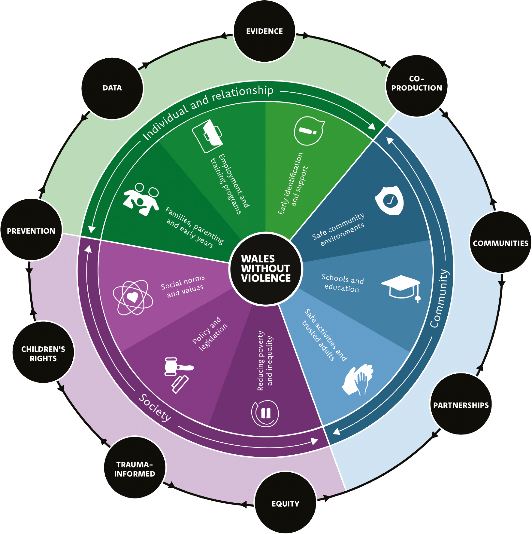 Snowdon, L., Parry, B., & Barton, E. (2025). Wales Without Violence: A shared framework for preventing violence among children and young people - infographic. Public Health Wales. https://waleswithoutviolence.com/the-framework/infographic-building-a-wales-without-violence/