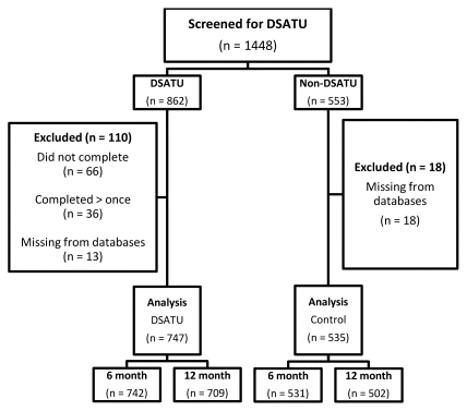 DSATU Group: A total of 43 five-week sessions were conducted between 2008 and 2014, which represented 862 cases of participation in the program. Sixty-six individuals did not complete the program. Of the remaining 796 cases, 36 were from individuals who had completed DSATU program more than once. Only the data from their most recent program completion were retained. Thirteen additional cases were omitted because they were missing from either the DSATU or CMIS databases. Ultimately, this left 747 unique cases retained for analysis (Figure 1).
