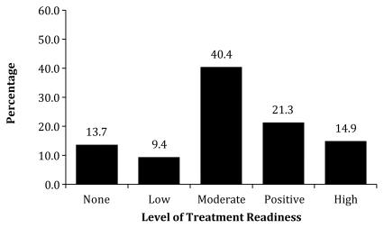 Screening results from the PRD, ADS, and DAST 20 instruments reveal that the vast majority of DSATU participants (88.2%; n = 666) were classified as requiring a high intensity addiction treatment program (Figure 2). Results from the TRI were more variable. One third of participants (36.2%) were screened as having a positive or high level of treatment readiness (Figure 3), but 175 (23.1%) participants demonstrated low or no treatment readiness.