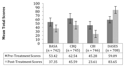 The pre- and post-treatment measures of treatment effectiveness were analyzed to determine whether participants showed improvement upon completion of the program (Figure 4).