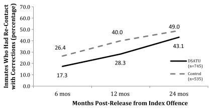 Severity of Re-contact: There were 424 individuals (DSATU n = 211, Controls n = 214) that became re-involved with corrections within 12 months of their release. Relative to their index offence, both the DSATU and control groups demonstrated an improvement in the crime severity ranking of their subsequent offence. The median seriousness ranking of the DSATU group’s index offence was 98 and was 109 for their second offence. Control group participants had a median crime severity rating of 87 for their baseline offence and a rating of 108 on their second offence. Higher seriousness rankings reflect less serious offences.