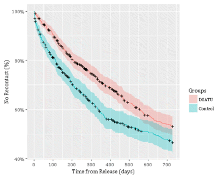 FIGURE 6 Kaplan-Meier curve for re-contact survival rates post institutional release for the DSATU and control groups. Cases that did not reconnect with corrections were censored. |
