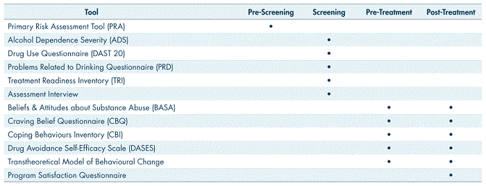 In addition to the institutional screening process for criminogenic risk, the DSATU utilizes an additional four screening tools and an assessment interview to determine addiction severity (treatment need) and treatment readiness (Table I). Eligible candidates are then further screened by DSATU program staff, by considering offender age, level of literacy, severity of mental health and/or behavioural issues, and compatibility with other participants. The tools are briefly described below.