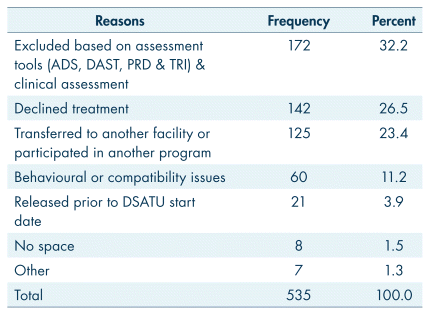 Control Group: Program staff screened an additional 553 inmates who were considered eligible for the treatment program based upon their criminogenic risk assessment (PRA score), but who did not go on to participate in the program. Of these 553 cases, 18 were missing from the CMIS database, leaving 535 valid cases for analysis. Reasons why control group members were not enrolled in the DSATU program are described in Table II.