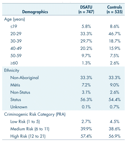 A retrospective analysis of the case files of DSATU participants (2008–09 to 2014–15 fiscal years) and a case-control analysis of DSATU program data and Corrections’ Case Management Information System (CMIS) data from the Ministry of Justice (2007–2015) were conducted.