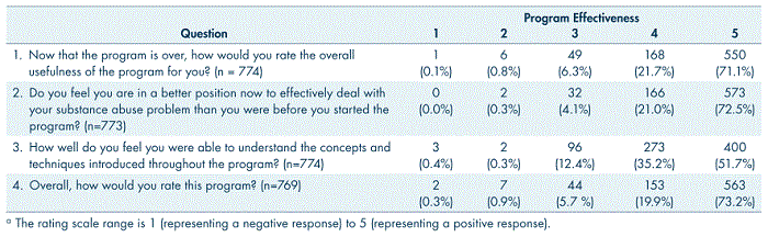 The DSATU program uses five measures to monitor treatment effectiveness (Table 1). Four measures are administered to program participants within the first week of treatment and again during the last week of treatment. The fifth instrument, a participant satisfaction questionnaire, is administered upon completion of the program.
