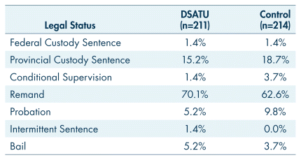 Type of Legal Status on Re-Contact: For the DSATU and control group participants who had re-contact with corrections within 12 months post-release, the majority were placed on remand (DSATU = 148 and control = 134) (Table V). The differences between the legal status categories were not statistically significant (χ2 = 7.368; df(5); p = 0.75, NS).