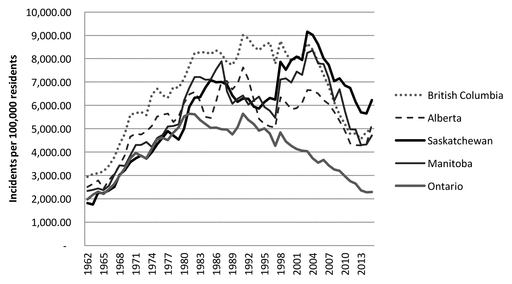 Crime rates trended downwards from 2003 to 2013 in western Canada, coinciding with an international resource boom. In particular, Saskatchewan experienced sharp increases in resource development, household income, and large in-migration movements, from both other provinces and nations, during a period termed the “Saskaboom”. Rapid economic and demographic change can have various effects on crime. Newcomers may have different behaviours and propensities to commit certain types of crimes. Improved employment outcomes of young males may reduce criminal activity. Inequalities in employment, incomes, and housing may lead to increased crime. Over the past few years with the decline in oil prices and revenues, some western Canadian provinces have experienced poor economic growth and increasing unemployment rates. What influence have demographic and economic changes had on crime rate patterns in the western Canadian provinces?