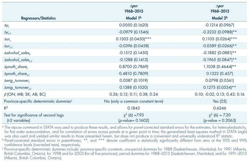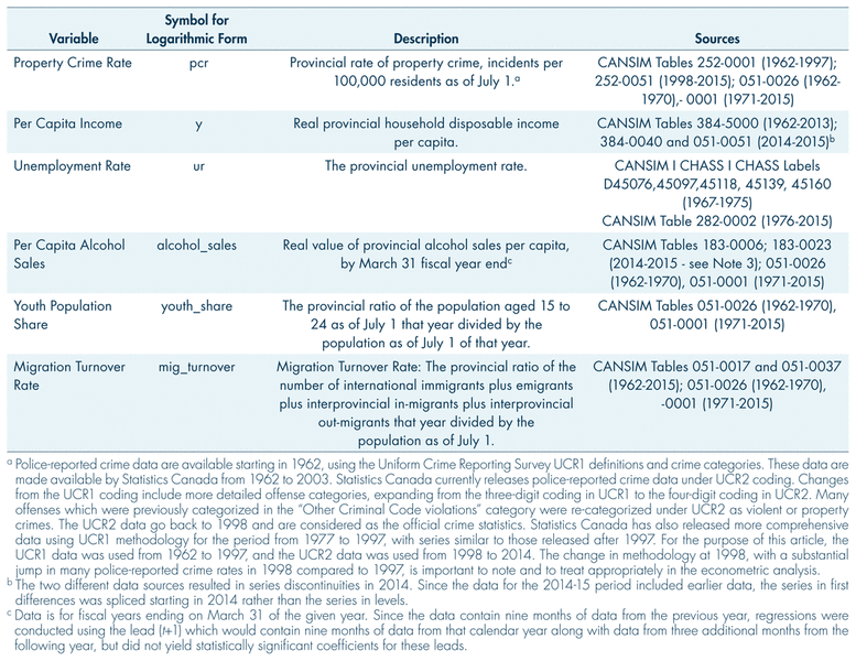 The relationship between rates of property crime and the economic and demographic variables for the panel of five provinces (British Columbia, Alberta, Saskatchewan, Manitoba, and Ontario) is investigated using a linear panel model. The set of provincial economic and demographic variables used in the analysis are described in Table 1. These variables are real household disposable income per capita, the unemployment rate, per capita alcohol sales, the youth share of the population, and the migration turnover rate (the sum of both in- and out-migration, as a proportion of the total population). Provincial data for unemployment rates are only available starting in 1967. These variables all exhibit the property of nonstationarity, and therefore require transformation using logarithmic first differences to allow for estimation to overcome the problems of stochastic trends and spurious regressions; as such, this study may not be directly compared to that of Andresen (2013), which presented results from a panel study with variables in their undifferenced logarithmic forms.2 In addition, a set dummy variables was used to account for additional province-specific trends and shifts in rates of property crime. The effective time period of the study is from 1968 to 2015.