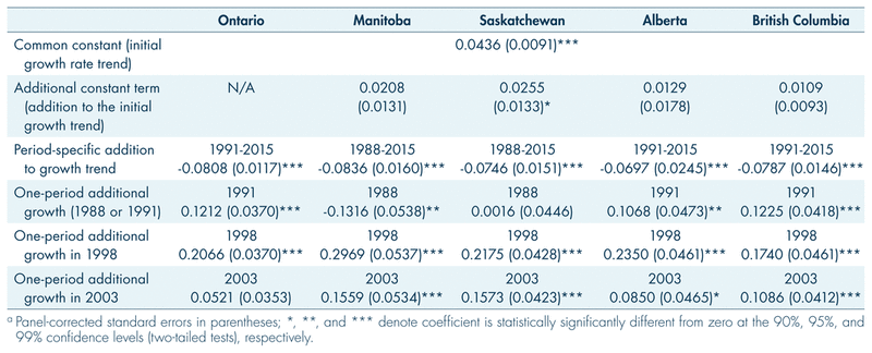 Significant changes in the pattern of property crime rates occurred around 1990, 1998, and 2003. The quantitative impact of these changes is highlighted in Table 3. Up to the late 1980s, rates of property crime in the five provinces grew by between four per cent (Ontario) and seven per cent (Saskatchewan) per year (the result of the combined impact of the common constant identified in the second row of Table 3 and the additional province-specific constant term in the third row). The growth trend in the rates of property crime in all five provinces fell significantly around 1990, by between seven and eight percentage points from previous rates of growth (as indicated by the period- and province-specific additions to the growth trend indicated in row four). This was a major turning point in the evolution of property crime, and coincided with the drop in the rate of total criminal code violations in Canada which occurred after the peak in 1991. The figures in the next row of Table 3 indicate the extent of special one-period changes (jumps) in the growth rates of property crime which occurred at the beginning of the trend decline. These identify a significant one-period drop in the rate of property crime for Manitoba in 1988 from a peak in 1987, and significant increases in the rates of property crime for Ontario, Alberta, and British Columbia to peaks in 1991, prior to the model-predicted trend decline in the rates.