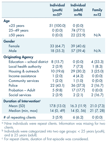 The majority of cases were single clients (93%) between the ages of 25 and 49 (77%). Although gender was evenly divided across the population, individuals under the age of 25 were more likely to be female (65%). Cases originated most frequently from police, probation, and housing outreach services, and were resolved within a mean period of 2–3 weeks. Half of all case closings were attributed to client engagement with appropriate services and supports. A minority (14%) of individuals and one family refused services. Nine (individual) client cases (6%) were re-opened at least once.