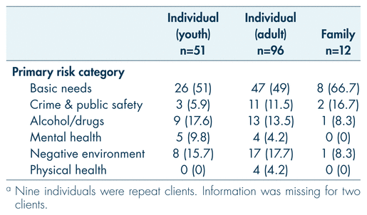 Categories of risk for the client population as assessed by SMART are presented in Table 2. The most prevalent category of risk was a high level of unmet basic need (e.g., housing, activities of daily living; 51%), followed by exposure to negative environment (e.g., physical or emotional abuse; 16%), and substance use (alcohol or other drugs; 14%). Crime (gang involvement or other criminal behaviour) and mental/physical health (disability, diagnosed disorder) were noted as risk factors in 10 per cent and 8 per cent of cases, respectively.