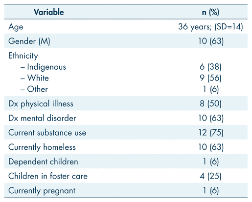 Of 28 individuals who were approached for an interview, 16 provided informed consent (10 elected not to participate, 2 were deemed by the investigators to be unable to consent). Self-reported characteristics of the interview sample were similar to those of the larger client population, and are presented in Table 3. The majority of participants were white (n = 9) and male (n = 10), with a mean age of 36 years. Six participants claimed Indigenous ethnicity. More than half were homeless and reported diagnosed mental disorder, current substance use, and chronic physical illness/injury. Five individuals had children under the age of 18, and one participant was pregnant.