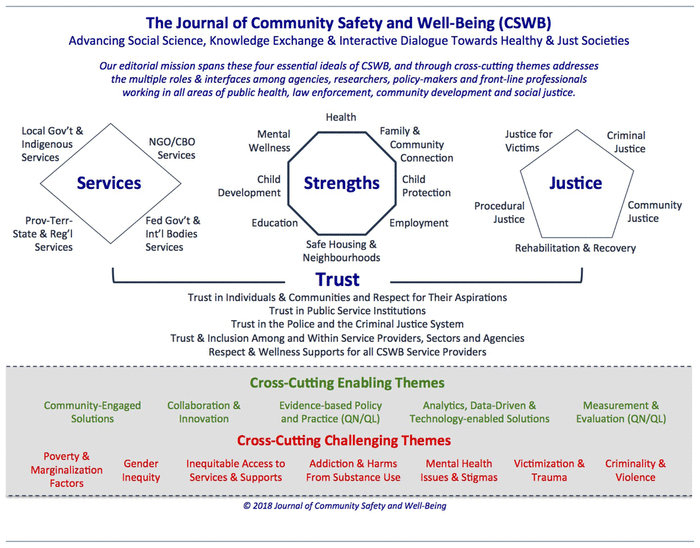 And so, as we prepared to re-launch our Journal’s ongoing production phase, we have reflected on several years of conversation with collaborative human services innovators and adopters, on current and emerging policies and practices, and on the growing body of literature and evidence-based scholarship that is variously underpinning, critiquing, and all the while attempting to give clearer definition to these and other closely related practices in Canada and abroad. We discovered that, whether consciously naming their efforts as CSWB (as is more familiar today across Canada and in parts of the USA), or focused on the interfaces among policing, justice, and public health (as in the Law Enforcement Public Health (LEPH) movement that has taken root more strongly in Australia and in parts of Europe), like-minded researchers and practitioners are indeed reflecting a lot of common cause.